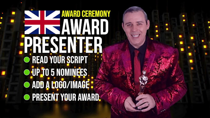 How cool would it be for your company to receive an AWARD at an award giving ceremony?I will be your host at the awards ceremony show event and read your script on camera in Full HD1080p
